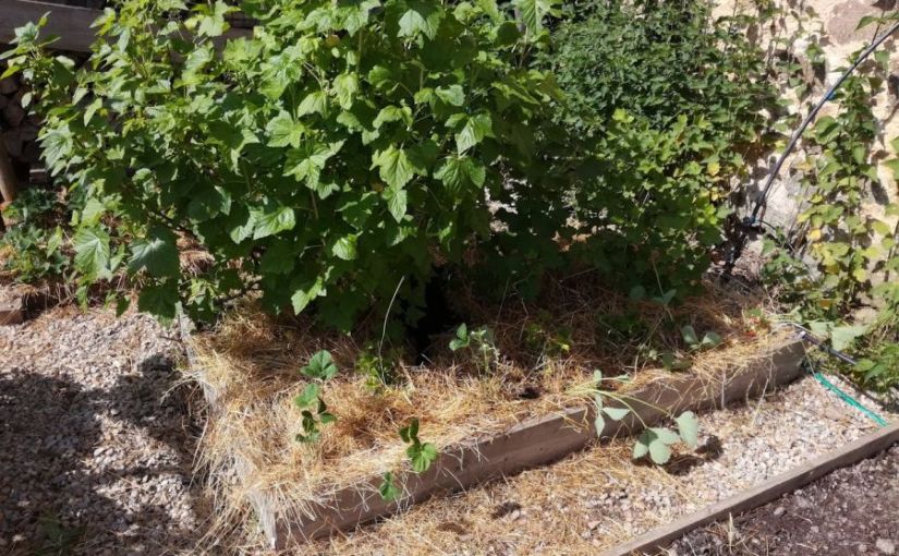 Foto : de oude moestuin met bessen, aardbeien en netels